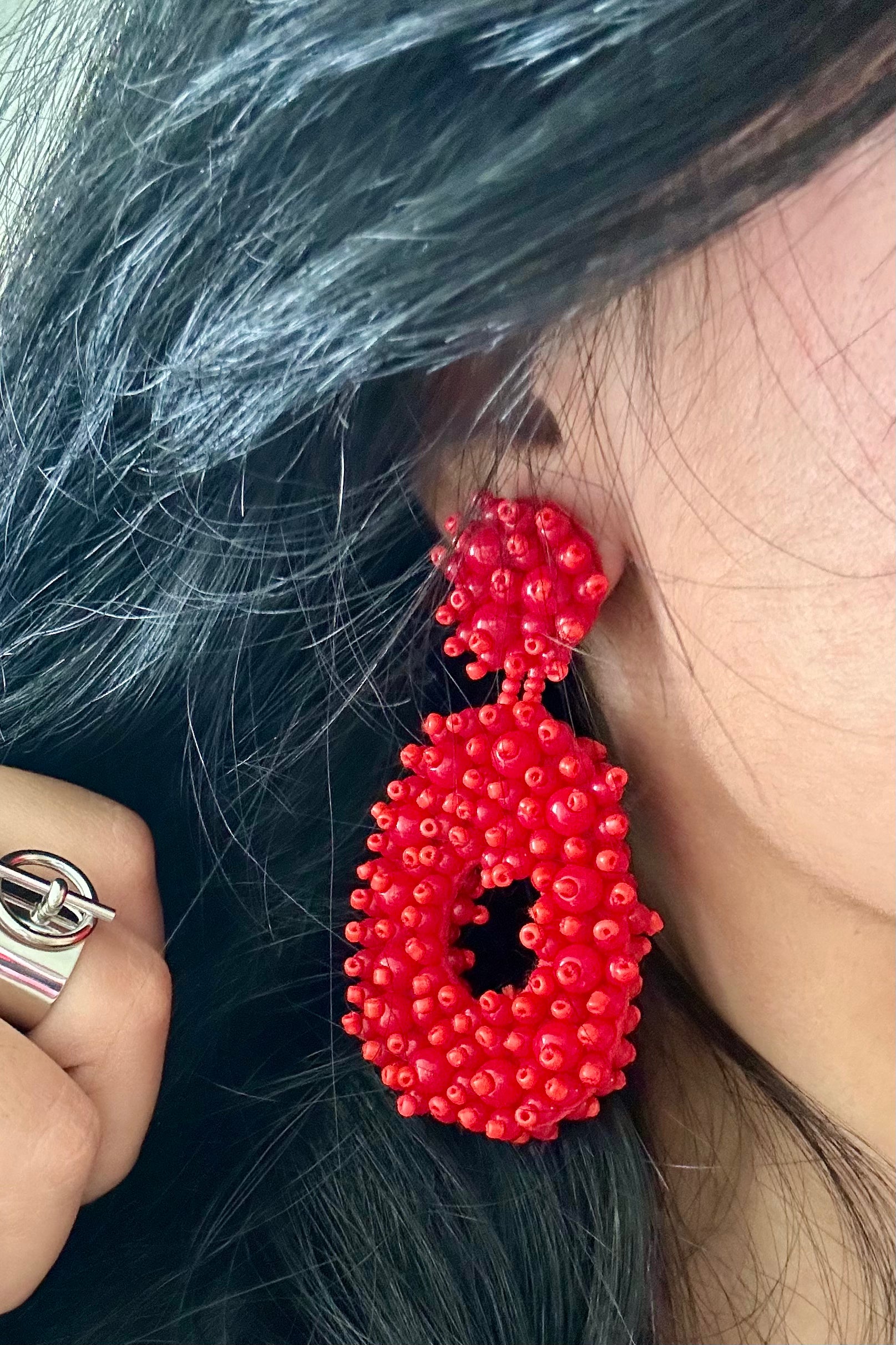 Experience the allure of these stunning handmade beaded earrings. The rich red hue is a fashion-forward statement, adding a pop of color to any outfit. Expertly crafted, these earrings are sure to elevate your style with their unique and vibrant design.