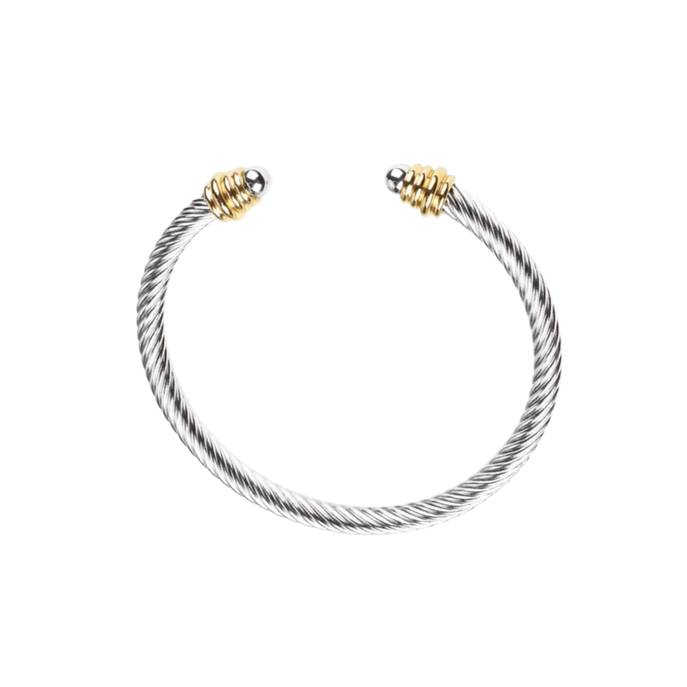 Expertly crafted with a statement design, the Anton Two Tone Bangle is the epitome of fashion. Made with a combination of gold and silver stainless steel, this adjustable bangle adds a touch of elegance to any outfit. Upgrade your style game with this must-have accessory.