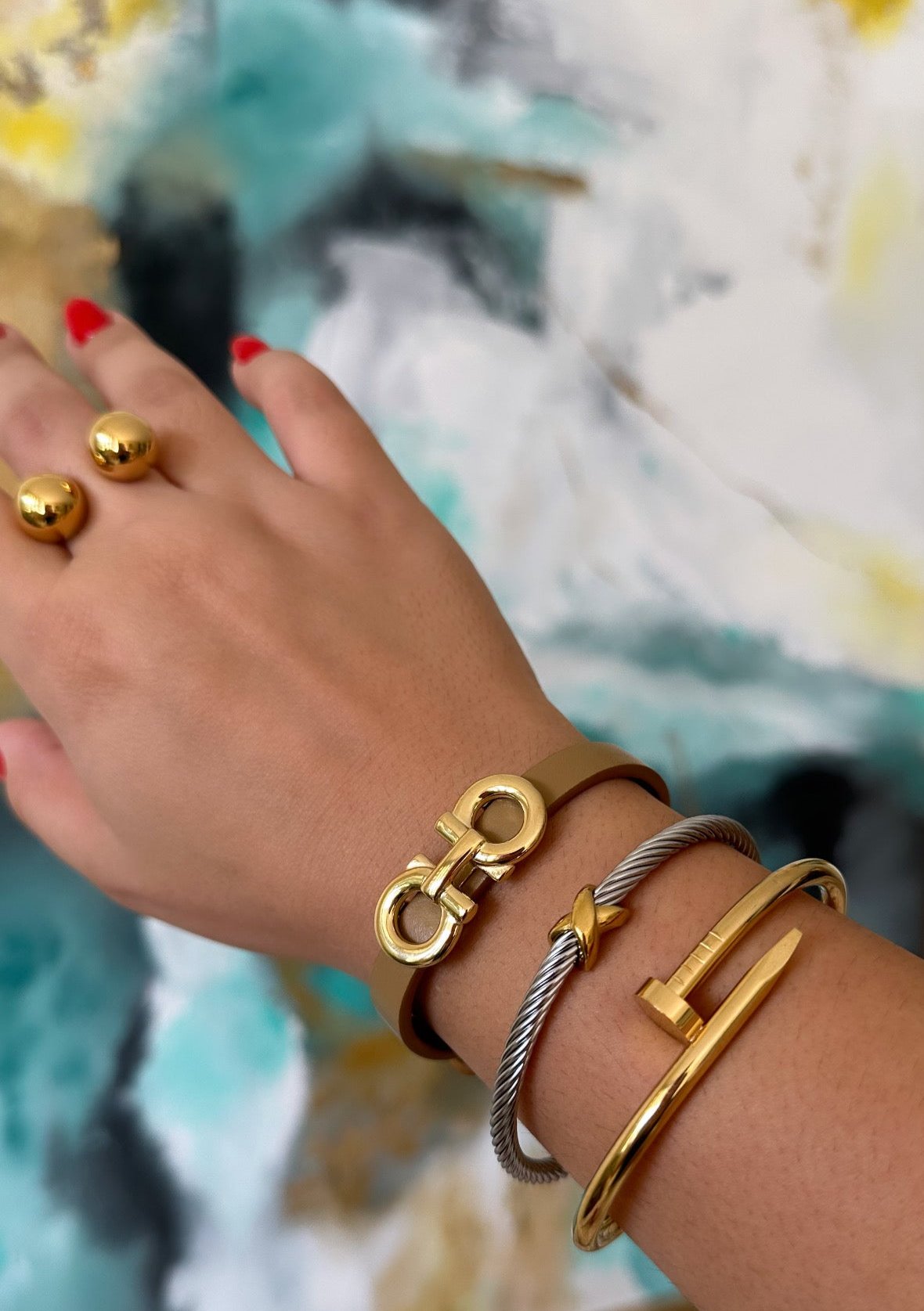 Add a touch of elegance to any outfit with the Penny Two Tone Bangle. Made from durable stainless steel and coated with 18k gold, this bangle features a stunning gold and silver design with a unique x pendant. Elevate your style with this luxurious piece!