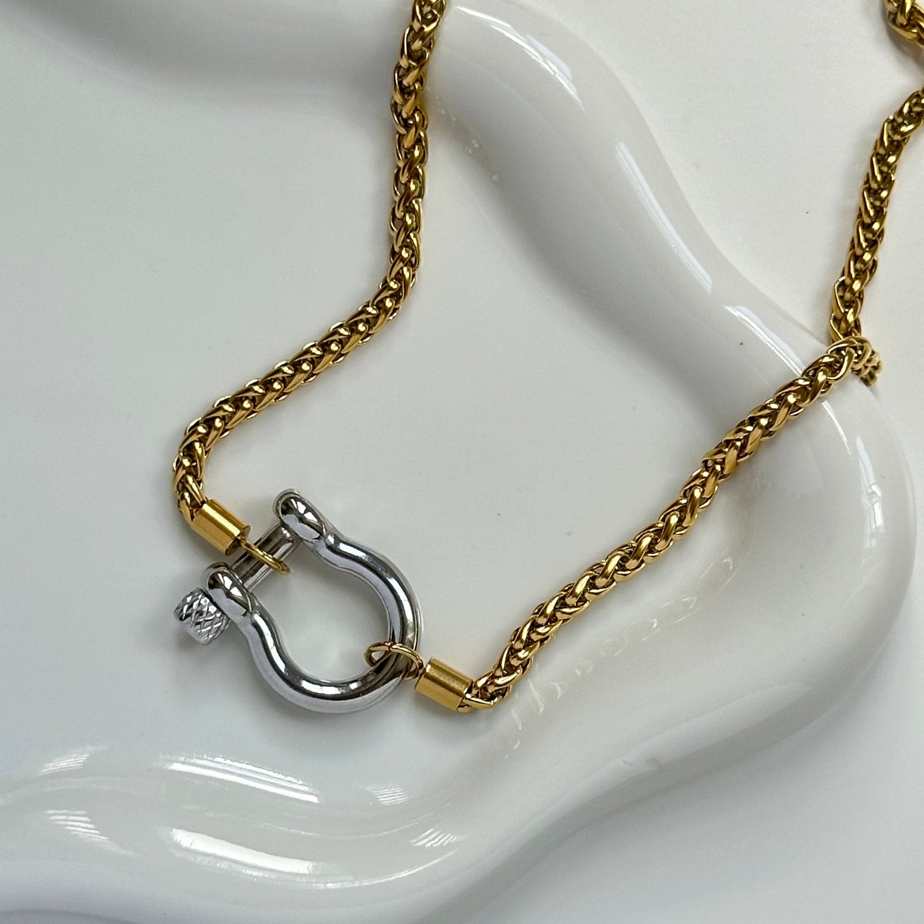 Introducing the Tessa Two Tone Statement Necklaces. Made with durable stainless steel, these bold necklaces feature a unique lock pendant. Elevate your fashion game with this eye-catching two-tone piece.