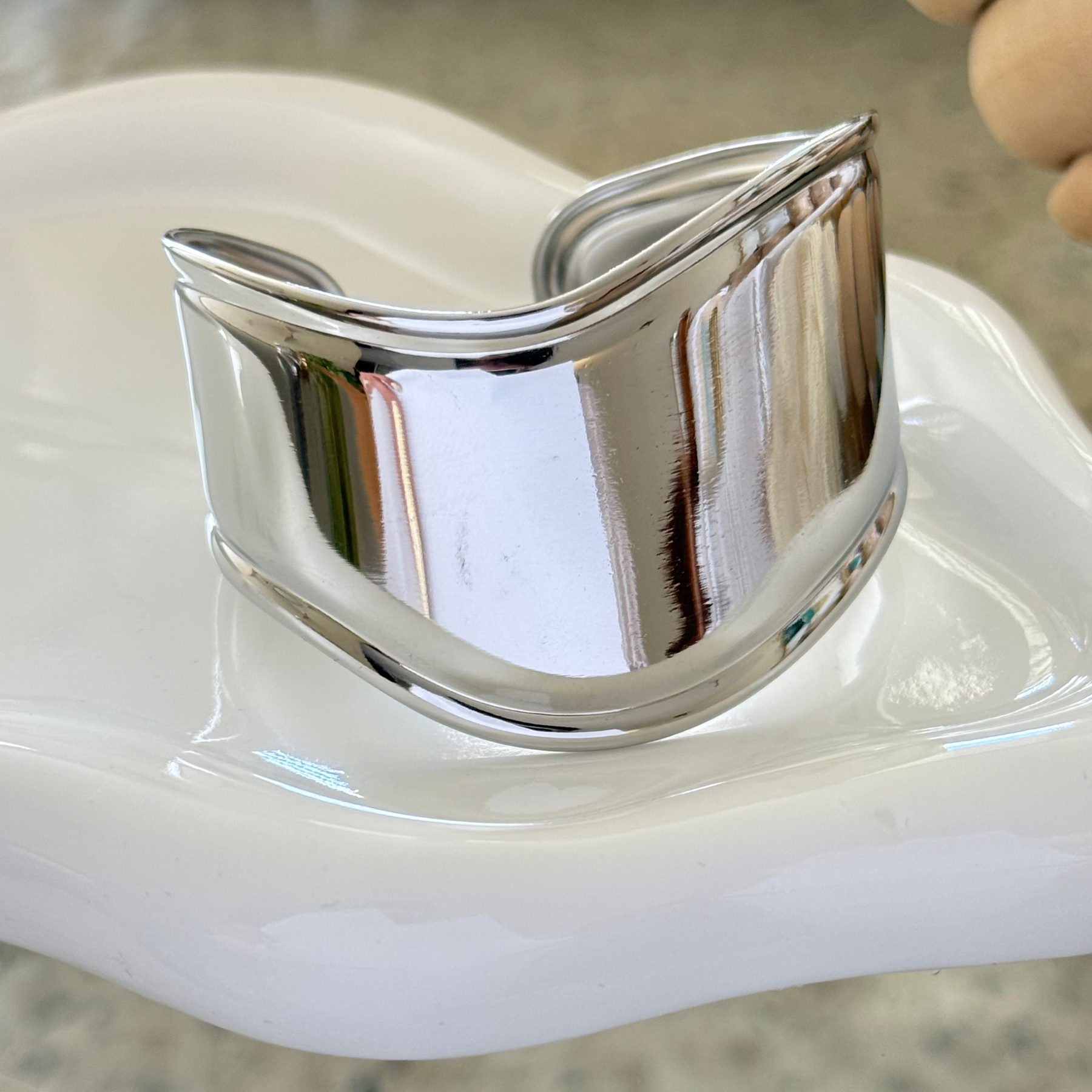 Indulge in the luxurious style of our Albania Silver Bangle. Made of stainless steel, this fashion-forward open bangle is perfect for summer. Its bulky design adds a touch of boldness to any outfit. Elevate your accessory game with this stunning piece!
